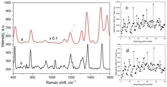 The mean SERS spectra of the R6G molecules (10−6 M) and SERS signal intensity of the 1363 cm−1 band at different scanning points: (a,c) on silver-coated mesoporous silicon at the 633 nm excitation wavelength and (b,d) on gold-coated macroporous silicon at the 785 nm excitation wavelength.