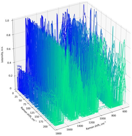 Firstly, three maps of the peptide SERS spectra for different pH levels were collected. Each map contained 225 spectra that were collected with a 1 µm step. An example of the SERS spectra array for the peptide adsorbed on the silver-based substrate from a solution with pH = 6.8 is depicted in Figure 3. This view of the SERS spectra array was typical for all the SERS maps. It can be clearly seen that the patterns of each spectrum were not completely repeatable in terms of the intensity, position, and number of Raman bands. In general, this was caused by the different orientations of the chemical bonds, the anharmonicity of oscillations during adsorption on the substrate, chemical binding to the silver particles, and the denaturation of peptides. However, the mean spectra for all the SERS maps were characterized by the same set of bands, showing the reliability of the measurements (Figure 4). The following bands could be seen in the SERS spectra: 1610 cm−1 (Trp residue), 1405 cm−1 (–CH3, def. from side chains of hydrophobic residues), 1285 cm−1 (amide III), 945 cm−1 (N–Cα–C), 859 cm−1 (asymmetric C-C-S stretching of Met side chains), and 754–758 cm−1 (Trp residues) [].