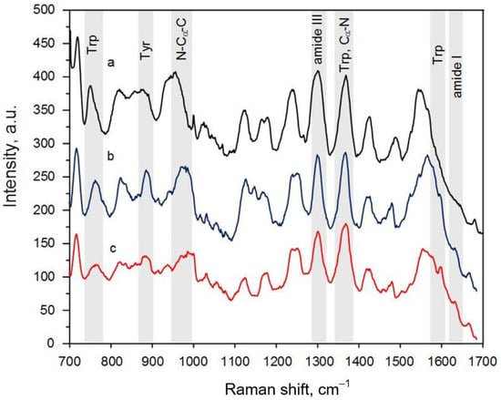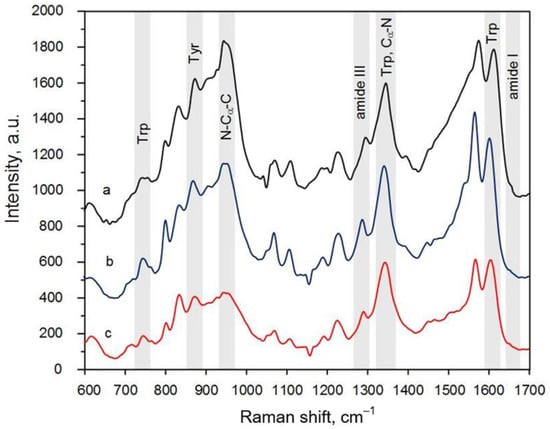 A reliable express analysis of diverse proteomic analytes, solving the problem of the simultaneous detection, identification, and structural study of target substances at low concentrations, is still an unfulfilled task in many areas, including but not limited to medicine [], biology [], forensics [], ecology [], and pharmaceutics []. In recent years, interest has gradually been growing in revealing the secondary structure of proteins and peptides in trace amounts [,,]. Many approaches can be used to study the secondary structure of proteomic analyte molecules. For instance, X-ray crystallography [,] and nuclear magnetic resonance spectroscopy [,] are traditionally exploited to achieve this goal. However, the short-peptide analysis offered by these methods is ineffective when a single sample contains various structural types of peptide or its oligomers are ordered in different ways. Circular dichroism (CD) spectroscopy is the most popular technique to overcome this hurdle [], but the Protein Circular Dichroism Data Bank is not rich enough to confidently state that the most appropriate spectrum completely characterizes the previously unknown secondary structure of a new peptide [,]. In addition, the presence of tryptophan residues in a peptide can hinder the CD signal from its secondary structure [,]. Even ignoring all these shortcomings, we need to understand that the above-mentioned methods can hardly be used to study proteins and peptides at rather low concentrations, which are often required for vaccine or assay development [,,].