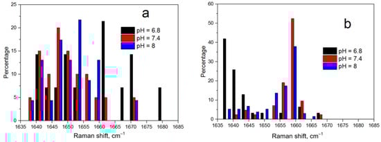 The SERS analysis with both silver and gold substrates showed that an alpha-helix structure dominated in the NQ21 peptide. This conclusion arose from the more frequent localization of histogram bands in the region of wavenumbers characteristic of an alpha helix, i.e., from 1637 to 1663 cm−1. However, no prominent regularities in the behavior of the amide I band according to the pH level were observed for the peptide SERS spectra registered on the silver particles. In addition, the corresponding histogram (Figure 6a) showed a tendency towards a mixed or random coil structure, especially for pH = 6.8, when black histogram lines could be seen near 1680 cm−1. This may have been caused by the partial denaturation of the NQ21 peptide on the silver particles, which was slightly inhibited in solutions with a pH > 7.4 due to the passivation of the SERS-active substrate through silver surface oxidation. Changes in the surface composition of the silver particles induced by sulfidation and/or oxidation could seriously affect the SERS-activity, e.g., suppressing it. The SERS spectra of NQ21 molecules collected from the silver-coated mesoporous silicon were characterized by a gradual decrease in the signal intensity when the pH level rose from 6.8 to 8.0, which was generally accepted to be caused by appearance of oxidation species. For example, the SERS intensity at the 945 cm−1 band (N–Cα–C) decreased from ~1000 a.u. at pH = 6.8 via ~700 a.u. at pH = 7.4 to ~370 a.u. at pH = 8.0. The same behavior was typical for other characteristic bands. The SERS measurements with the gold “nanovoids” showed that the position of the amide I band shifted from 1638 cm−1 to a higher wavenumber (approx. 1663 cm−1) with a pH level increase but was still typical of an alpha-helix structure. The percentage of the SERS spectra containing the amide I band at a position related to beta-sheets (between 1665 and 1670 cm−1) was negligible and did not exceed 2–3%. The position of the amide III band in the averaged spectra within the range of 1270–1300 cm−1 also favored the prevalence of an alpha-helix structure in the NQ21 peptide [].