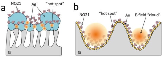 Scheme showing the anchoring configurations of NQ21 on the surfaces of (a) silver particles on mesoporous silicon and (b) gold “nanovoids” in macroporous silicon.