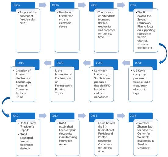 Although the concept of flexible solar cells was proposed in the 1960s and organic electronic devices with flexible characteristics were developed in the 1980s, it is only within the last two decades that international research on product flexibility has truly taken off. In 2006, the scientific community first introduced the concept of malleable inorganic flexible electronics [1]. In 2007, the European Union adopted the Seventh Framework Programme and invested billions of euros in research and development to focus on flexible displays, photovoltaics, sensing, and wearable devices [2]. In 2008, the United States Kovio Company achieved a significant milestone in the realm of printed electronics by successfully fabricating flexible radio frequency electronic tags (also known as radio-frequency identification: RFID) using inkjet-printed nanosilicon ink. In 2009, Soon Chun University in Korea advanced RFID technology further by employing roll-to-roll printing with inorganic nanomaterial inks like carbon nanotubes. Additionally, in the same year, international academic conferences on the theme of flexible printing were held in Europe and Asia, respectively [3,4]. Since 2009, there has been a turning point in international research and discussion focused on flexible applications, resulting in an increasing number of related associations and companies. In 2010, the Printed Electronics Technology Research Center was established by the Chinese Academy of Sciences Suzhou Institute of Nanotechnology and Nanobionics, and in 2014, China hosted the 5th International Conference on Flexible and Printed Electronics (ICFPE) for the first time [3,4]. In 2012, the U.S. Presidential Report identified flexible electronics manufacturing as a cutting-edge area for development; that same year, NASA formulated a strategy for flexible electronics and established the Flexible Hybrid Electronics Manufacturing Innovation Center in 2014 [2]. In 2016, Professor Zhenan Bao, a distinguished figure in the field of flexible electronics, established the Center for Wearable Electronics at Stanford University. Industry experts predict that the global flexible electronics market will experience a double-digit growth rate to reach $250 billion by 2025 [5]. The flexible display market is currently dominated by international companies such as Samsung and LG from South Korea and Toshiba and Sharp from Japan. Meanwhile, Flagship from Japan and M-FIEX from the United States have a significant advantage in the field of flexible circuits [6] (Figure 1).