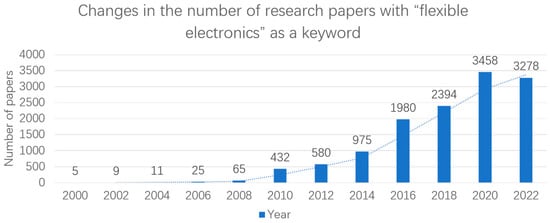 Changes in the number of research papers with the keyword “flexible electronics” in the past 20 years (data source: Web of Science).