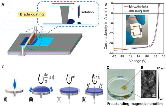 (A) Schematic diagram of the scraping process. (B) J–V curves of a 1 cm2 blade coating device; the inset is the actual device [49]. Copyright 2019, John Wiley and Sons. (C) Schematic diagram of spin-coating process stages: (i) dispensing stage; (ii) substrate acceleration stage; (iii) steady liquid outflow; and (iv) solvent evaporation. (D) The prepared nanofilm floats on the water’s surface. (E) Atomic force microscope scan of the nanofilm [50]. Copyright 2021, Royal Society of Chemistry.