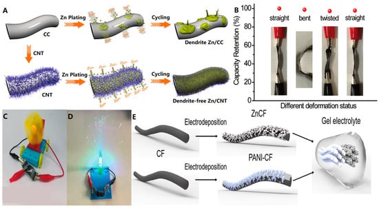 (A) Schematic diagram of Zn deposition on CC and CNT electrodes. (B) Capacity retention of quasi-solid-state Zn/MnO2 batteries with a Zn/CNT anode under different deformation states. (C,D) Photograph of the connected quasi-solid-state Zn/MnO2 battery powering the rotating fan (C) and LED light (D) [62]. Copyright 2019, John Wiley and Sons. (E) Schematic illustration of the fabrication of solid-state fibrous Zn/PANI batteries [63]. Copyright 2021, American Chemical Society.