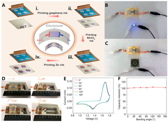 Wang et al. [71] successfully fabricated Zn//MnO2 planar microcells (MBs) using screen printing. Figure 8A illustrates the process of creating the Zn//MnO2 planar MB by printing the highly conductive graphene ink as the current collector, the Zn-based ink as the anode, and the MnO2-based ink as the cathode on the substrate. The MB was then packaged. This method yielded a Zn//MnO2 planar MB with suitable ink rheological properties, high conductivity of the microelectrodes, and impressive performance characteristics. The MB exhibited a high bulk energy density, excellent safety, long-term cycling stability (83.9% capacity retention after 1300 cycles at a high rate of 5C), and superior flexibility. In addition, the functionality of the MBs was demonstrated in Figure 8B,C, where the MBs successfully powered a light-emitting diode (LED) for an extended period even when bent. Furthermore, the MBs were able to illuminate a display screen. Figure 8D–F shows that all cyclic voltammetry (CV) curves of MBs overlapped under different bending angles, with almost 100% capacity retention even at a bending angle of 180°.