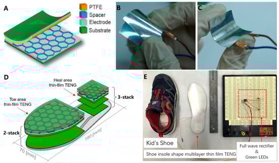 (A) 3D structure diagram of thin-film TENG. (B,C) Photograph of a single thin-film TENG. (D,E) Insole MT-TENG: (D) was a schematic diagram of the structure of the insole generator using MT-TENG; (E) was the setting of the insole generator [72]. Copyright 2018, John Wiley and Sons.