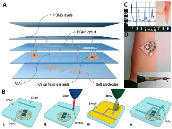 - Marques, D.G.; Lopes, P.A.; de Almeida, A.T.; Majidi, C.; Tavakoli, M. Reliable interfaces for EGaIn multi-layer stretchable circuits and microelectronics. Lab A Chip 2019, 19, 897–906. [Google Scholar] [CrossRef]