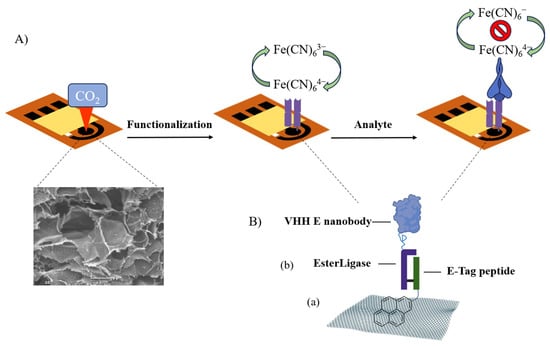 In this study, a disposable single-use electrochemical biosensor for the detection of SARS-CoV-2 spike protein was developed. The disposable laser-scribed graphene electrodes were produced and modified by immobilizing SARS-CoV-2 spike protein utilizing a split-ester bond ligase system []. Firstly, an ester bond peptide tag (E-Tag) was modified with a C-terminal pyrene and immobilized on the graphene electrode. A spike-specific VHH E nanobody [] genetically fused with a C-terminal ester bond ligase (EsterLigase) was subsequently captured and covalently ligated to the electrode via a spontaneous autocatalytic ester bond formed between the E-Tag and EsterLigase. The presence of the SARS-CoV-2 spike protein containing the receptor-binding domain (SP-RBD) was then measured by electrochemical impedance spectroscopy (EIS) in a buffer solution containing a ferri/ferrocyanide (Fe[(CN)6]3−/4−) redox couple. A linear detection range from 150 pM to 15 nM, a LoD of 7.68 pM, and excellent selectivity towards other potential viral proteins were demonstrated.