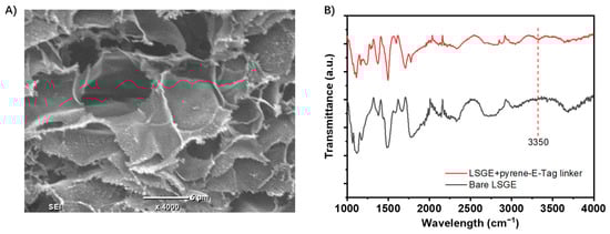 The morphology of the bare LSG electrodes was characterized by SEM imaging (Figure 2A). The highly porous structure of the LSG electrode can be observed, which indicates a high surface area for surface functionalization []. FTIR spectrum of the LSG electrode before and after the modification with the pyrene-E-Tag linker (Figure 2B) confirms the successful attachment of the pyrene-E-Tag linker on the LSG surface. A new peak around 3350 cm−1, corresponding to the N-H stretch from the secondary amine within pyrene-E-Tag linker, was observed after the modification.