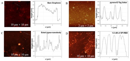 AFM was employed to characterize the functionalization of the working electrode. Since the porous LSG was not ideal for AFM studies, a low-dimensional graphene surface was fabricated for AFM measurements. The bare graphene layer had a thickness of 3 ± 0.5 nm (Figure 3A), while the pyrene-E-Tag linker functionalized graphene had a thickness of ~5 nm (Figure 3B). After the conjugation of EsterLigase-nanobody, the thickness increased to 10–15 nm, where the thickness of EsterLigase-nanobody was ca. 5–10 nm, calculated by subtracting the thickness of pyrene-E-Tag linker (Figure 3C). The thickness of SP-RBD was estimated as 25–30 nm in Figure 3D. The increment in thickness from 3 nm for bare graphene to ~40 nm after all steps of modification indicates a successful functionalization of the graphene surface.