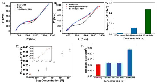 Nyquist plot of (A) LSG/PBA/EsterLigase-nanobody and (B) LSG/ LSG/PBA-pyrene-E-Tag linker after exposure to 1.5 nM SP-RBD. (C) Normalized responses (∆Rct/Rct0) from (A,B). ∆Rct/Rct0 to 1.5 nM SP-RBD as a positive given for comparison. (D) Calibration curve of the LSG/PBA-pyrene-E-Tag linker/EsterLigase-nanobody sensor (∆Rct/Rct0) for the detection of SARS-CoV-2 SP- RBD at different concentrations from 15 pM to 150 nM (n = 3) and the control LSG electrode strip with the modification with only PBA after the detection of 1.5 nM of SP-RBD. (E) LSG/PBA-pyrene-E-Tag linker/EsterLigase-nanobody sensor responses, ∆Rct/Rct0, after exposure to H1N1 and H3N2 influenza spike proteins (n = 3), as controls. ∆Rct/Rct0 to 1.5 nM SP-RBD as a positive given for comparison. (Error bars were obtained from the standard deviations of 3 independent experiments).