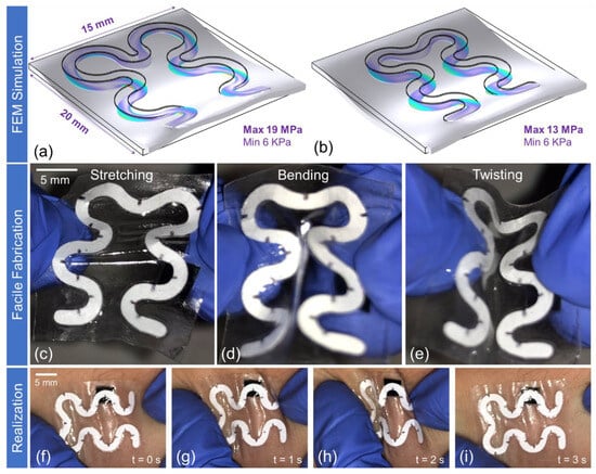 Figure 2a illustrates the preliminary design of the channel layer, while Figure 2b presents the optimized design through FEM simulations. Compared to its predecessor, the optimized design demonstrated a 30% reduction in stress. This accomplishment is attributed to the strategic pursuit of smoother and more uniform geometries, which enhances the mechanical resilience of the unit against tensile deformation. The mechanical stability of the developed unit was assessed through two experimental scenarios: in vitro and in situ evaluations. In the initial in vitro assessment, the unit underwent deliberate stretching (Figure 2c), bending (Figure 2d), and twisting (Figure 2e) actions. Subsequently, the unit was attached to male and female volunteers, replicating analogous deformations (Figure 2f–i). These comprehensive assessments were captured through video recordings, conclusively demonstrating the mechanical resilience of the unit against the applied forces (Supplementary Video SI, 5:20 until 6:30, and Supplementary Video SII).