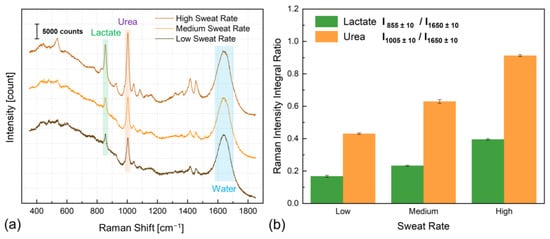 (a) Unprocessed Raman spectra (without baseline correction and smoothing) as acquired from human sweat induced by varying exercise intensities, manifesting different sweat rates. Highlighted within these spectra are the shifts corresponding to the characteristic Raman shifts of lactate and urea, positioned at around 855 and 1005 cm−1, respectively, and a broad water-related band centered around 1650 cm−1. Offsets were added to spectra for visualization. (b) The intensity changes in lactate and urea Raman bands, which correspond to the concentration change in sweat collected with diverse sweat rates, reveal the discernible impact of the sweat rate on the analyte concentration.