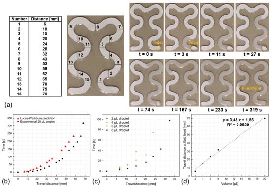 Similarly, Figure 4c illustrates the travel distances associated with other tested volumes. Indeed, Figure 4d shows the linear dependency of the final data point in Figure 4c (the fluid front position) for each fluid volume with a high R2 value of 99.29% and a high sensitivity of 3.48 μL/mm. The experimental scenario with 20 μL volume necessitated 319 s for traversal across 70 mm and culminated in a wicking rate of 3.76 μL/min (standardized to the presented design associated with the porosity of the chosen material and geometry of the designed pattern). As a great advantage, even compared against exceptional sweat rate cases such as the renowned athlete Alberto Salazar, who achieved an extraordinary sweat rate of 3.7 L per hour while training for the 1984 Summer Olympics, the wicking rate of this paperfluidic remains more than this maximum possible human sweat rate. Indeed, for a skin surface area, the maximum possible sweat rate, as mentioned earlier, corresponds to ~370 μL/cm2/h, and for a circular area with 2 mm diameter (the inlet of this paperfluidic), this value corresponds to 0.19 μL/min, which is ~19 times lower than the wicking rate of this paperfluidic unit.