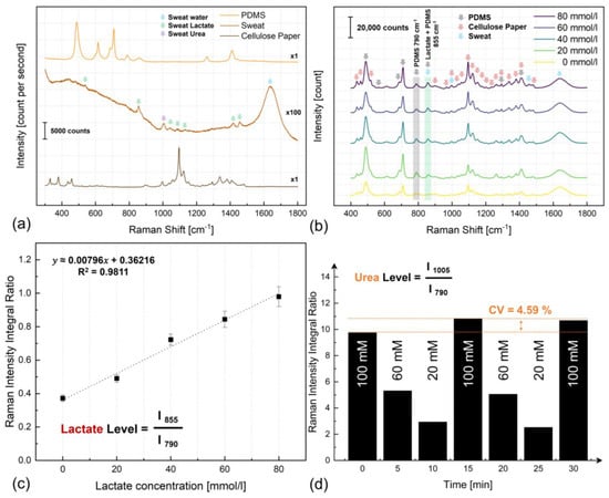 Given that the Raman spectral intensity of liquid sweat is approximately two orders of magnitude weaker than that of cellulose and PDMS Raman responses, their superimposition results in the dominance of Raman bands associated with PDMS or cellulose bands rather than sweat components. Nevertheless, it is still feasible to identify bands related to lactate, which remain unaffected by the substantial Raman activity of the cellulose paper substrate—specifically, the lactate peaks at 855 and 1457 cm−1. While the former band coincides with a less intense Raman activity of PDMS at 857 cm−1, the latter lactate-associated band remains unobstructed by PDMS interference. In an ideal scenario, if the latter lactate-associated band exhibited an intense presence, it could be harnessed for quantifying lactate levels. However, our prior investigations have demonstrated that the biosensing utilizing the former lactate band exhibits a nearly 100% higher sensitivity than the latter [7]. In addition, during experimentation with paperfluidics, we encountered limitations in utilizing the latter band to accurately assess physiological lactate concentration levels below 40 mmol/L. Hence, the sole avenue for lactate level analysis utilizing the Raman-paper fluidics platform lies in utilizing the 855 cm−1 band, which, in this instance, is inevitably subject to interference from one of the small Raman bands of PDMS.