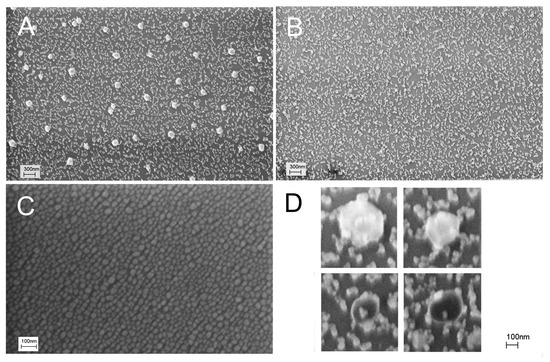 Firstly, we checked whether distortion of the nanostructured surface occurs during virus binding, similar to what was reported in references [22,23]. We used a concentration of IAV 10 times lower than the LoD of the reported sensor, namely, 6 × 104 VP/mL. Scanning electron microscopy revealed large particles in the sensor zones treated with IAV (Figure 1A). The mean diameter of the particles was 110 ± 20 nm, which is close to the expected diameter of IAV of 80–120 nm [29,30]. Electron microscopy was performed without the deposition of additional contrasting agents like heavy metals. Viruses are not to be observed under these conditions, so the most possible explanation for the observed 100 nm nanoparticles is the aggregation of silver nanoparticles around virions. This hypothesis is supported by the large empty spots around the viruses. The enlarged images of the spherical objects are provided in Figure 1D, showing viral particles surrounded by silver nanoparticles.