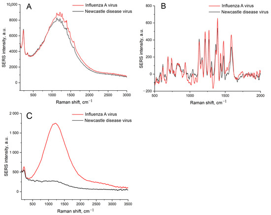 A comparison of the SEL (A,C) and SERS (B) spectra of the sensors with the initial setup with IAV or NDV. A concentration of labeled aptamer was 1 μM (A,B) or 100 nM (C). A concentration of IAV, 6 × 104 VP/mL, was 10-times lower than the LoD of the sensor.