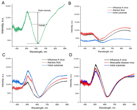The spectra of surface plasmonic resonance for the nanoisland substrates before and after the treatment with IAV or biological fluid (NDV/allantoic fluid without viruses). (A) A peak intensity and a full width at half maximum (FWHM) are the estimated parameters of the spectra. (B) The spectra of the substrates without chromium in the setup from ref. [25]. (C) The spectra of the substrates with chromium in the setup from ref. [25]. (D) The spectra of the substrates with chromium in the novel setup with the displacement of PBS with nitrate-based TrisNa buffer.