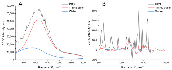 The immobilized aptamer, SH-RHA0385-Cy3, was labeled with a Cyanine-3 (Cy3) fluorophore. The samples were subjected to the SERS experiment, which provided the highest intensity of Cy3 SERS spectra for the PBS-treated sample, 5-times lower intensity in TrisNa buffer, and 10-times lower intensity in water (Figure 6). These results can be interpreted in the following way: The ionic strength of the solution is necessary for the efficient immobilization of the aptamer onto the surface, as can be seen from the luminescence intensity (Figure 6A). The most possible reason for the highest SERS in PBS solution is the shift of the peak center of surface plasmon resonance from 628 nm to 535 nm in PBS solution (Table 1). The value of 535 nm coincides with the wavelength of 532 nm of the Raman spectroscope laser.