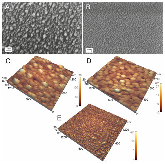 Thin metal layers were deposited onto the silicon substrate with a silica oxide layer with a thickness of 300 nm. The deposition was carried out with the vacuum spraying system NANO 38 (Kurt J. Lesker Company, Jefferson Hills, PA, USA) equipped with an automatic thickness controller. A spraying rate was 0.4 Å/s; pressure was 8 × 10−7 Torr. A plate with the samples was rotated at a rate of 20 rotations per minute. The nominal thickness of the silver layer was 60 Å for the substrates without the chromium layer. The substrates with two metals were sprayed sequentially. Firstly, the chromium layer with a nominal thickness of 10 Å was formed. Then, the silver layer with a nominal thickness of 60 Å was created. The substrates were heated at 120 °C for 6 min using the HP-20D-Set thermostat (Daihan Scientific, Wonju, Republic of Korea).
