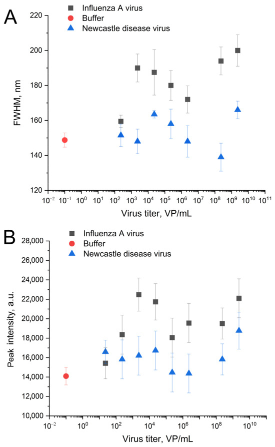 The changes in spectra of surface plasmonic resonance of the nanoisland substrates after the treatment with IAV or NDV in the novel setup. Dependencies of full width at half maximum (FWHM) (A) and peak intensities (B) on the virus content.