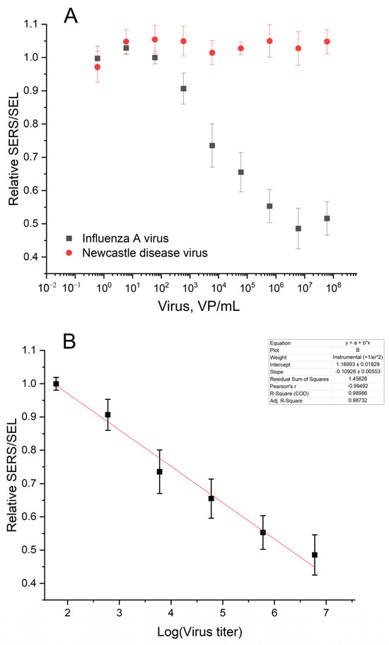 The SERS and SEL intensities increased in the presence of the influenza A virus. The absolute values had moderate reproducibility from batch to batch of the sensors. However, the relative SERS/SEL ratio calculated as (SERS/SEL)Experiment zone/(SERS/SEL)Control zone was highly reproducible. The SERS/SEL ratio was the same in the presence of allantoic fluid and NDV, demonstrating no effect from the off-target virus and a virus-free biological fluid. The relative SERS/SEL ratio provided not only reproducibility but also a monotonous concentration dependence (Figure 9). The relative SERS/SEL ratio decreased monotonously with the increase in IAV content from 60 to 6 × 106 VP/mL. Further increases in IAV did not change the signal reaching the plateau. The limit of detection was estimated as a virus concentration that caused changes greater than three standard deviations from the control sample (allantoic fluid with the same dilution). The LoD was estimated at 190 VP/mL.