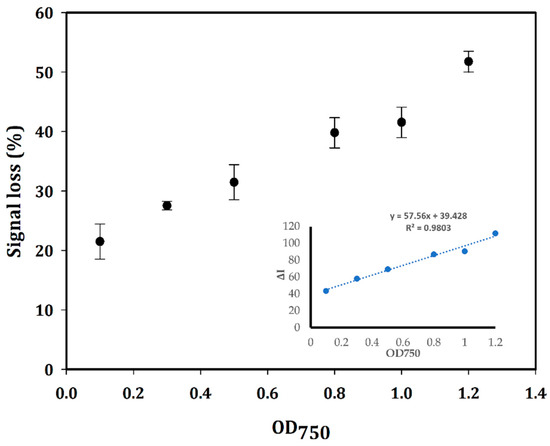 Plot of signal loss in percentage (%) for different amounts of bacterial cells defined as OD750 and the linear calibration curve of the aptasensor plotted by the decrease of peak current (ΔI) vs. OD750 with R2 = 0.9803. The SWV measurements were conducted on three different modified Au-SPEs. The mean and SD values are based on an average of measurements on three different modified SPEs.