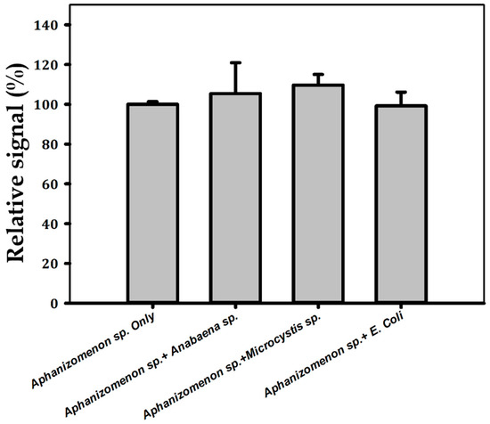 Selectivity of the aptasensor evaluated with interfering species in the mixtures of Aphanizomenon sp. ULC602 with Anabaena sp. ULC080, Microcystis sp. ULC641 and E. coli ATCC11330. All bacteria were obtained at OD750~0.5. The signal obtained from Aphanizomenon sp. ULC602 only is considered to be 100%.