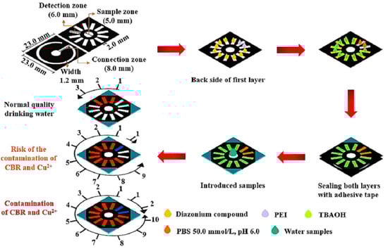 The counting-based signal readout sensor was first reported by Lewis et al. [26]. In this study, the number of colored bars can be employed to identify the amount of H2O2. A similar study was also reported by Khachornsakkul et al. [27], who employed a novel counting-based instrument-free signal readout device designed to detect the Cu2+ and carbaryl (CBR) in real samples. The paper analytical device, depicted in Figure 3, is constructed with two layers of filter paper; the initial layer is equipped with twelve detection zones, all of which have been pre-loaded with specific reagents to measure Cu2+ and CBR, and the subsequent layer is used to establish a pathway between the sample and detection zones. After the introduction of samples containing Cu2+ or CBR, they can react with the reagent that had been previously deposited and produce a color change in each successive zone. The concentration of Cu2+ and CBR can be ascertained by measuring the number of blue and orange detection areas, respectively. Finally, this method has demonstrated its capacity to analyze Cu2+ and CBR in the ranges of 1.25–15.0 μg/mL and 0.01–0.12 μg/mL, with an LOQ of 1.25 μg/mL and 0.01 μg/mL, respectively. To overcome the challenges of using sub-microliter sample volumes for semi-quantitative assay, a paper-based microfluidic sensor was innovatively created to enable the semi-quantitative detection of both immunoglobulin (IgE) and glucose through the use of a counting-based lateral flow assay [28]. In this study, three points along the sample flow path were supplied with 0.2 μL of the assay reagent, resulting in a count-based colorimetric assay signal. After the introduction of the analyte, they can react with the reagent that had been previously deposited at the test points and produce a color change at each point. The levels of IgE and glucose can be determined by counting the colored points. Through the developed method, it is possible to analyze IgE and glucose concentrations ranging from 0 to 400 ng/mL and 0 to 12 mmol/L, respectively.