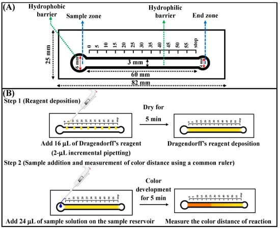 (A) The size of the distance-based paper sensor. (B) Schematic of distance-based instrument-free signal readout technology for the detection of sibutramine. Reprinted with permission from Ref. [54].