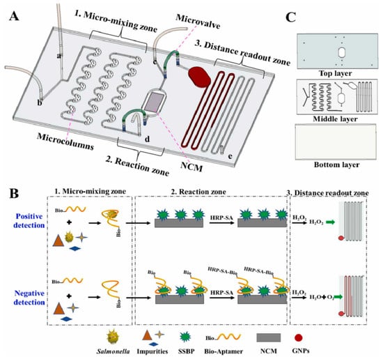 Schematic illustration of the principle of distance-based microfluidic aptasensor for the visual quantitative detection of Salmonella. (A) Structure and functional area distribution of a distance-based microfluidic aptasensor. (B) The detection principle of a distance-based microfluidic aptasensor. (C) The structure of the designed microfluidic chip. Reprinted with permission from Ref. [70].