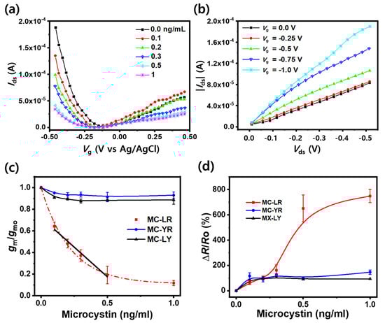Figure 3d illustrates the selectivity of the FET sensor, represented as ΔR/Ro × 100, in response to varying concentrations of MC-LR, MC-YR, and MC-LY. Despite the substantial structural similarities among MC-LR, MC-YR, and MC-LY, the MCTA-MWCNT FET sensor demonstrated a pronounced selectivity toward MC-LR in the examined concentration range. In the concentration range of 0.0–1.0 ng/mL, MC-YR and MC-LY exhibited nearly invariant and relatively small values of the gm/gmo, whereas gm/gmo decreased consistently with increasing MC-LR concentration. This observation indicates the selectivity of the fabricated FET sensor for MC-LR in the presence of its congeners.