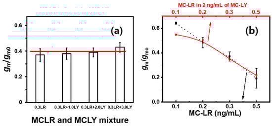 Relative transconductance values of (a) MC-LR (0.3 ng/mL) estimated at high levels of MC-LY-spiked PBS buffer (1.0, 2.0, and 3.0 ng/mL), the red line is the relative transconductance of 0.3 ng/mL MC-LR, and (b) MC-LR (0.1–0.5 ng/mL) at a high concentration of MC-LY-spiked PBS buffer (2.0 ng/mL).