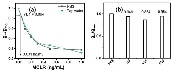 Biochemical assays of natural waters can be affected by diverse chemical and physical contaminants present in the water [58]. Thus, it is imperative to carefully examine the potential matrix effects, especially when the assay is geared toward detecting trace levels of chemical constituents in natural water resources. Notably, the MCTA-MWCNT-based FET displayed a conspicuous absence of the matrix effect. Figure 5a indicates that the gm/gmo values corresponding to 0, 0.2, 0.3, 0.5, and 1.0 ng/mL of MC-LR-spiked tap water filtered with 0.45 μm sized pores aligned with those from equivalent MC-LR levels in PBS. This observation suggests that the calibration curve obtained using PBS buffer as a surrogate for tap water sourced from the Nakdong River (Busan, Republic of Korea) remains valid for assessing MC-LR levels in water from this river.