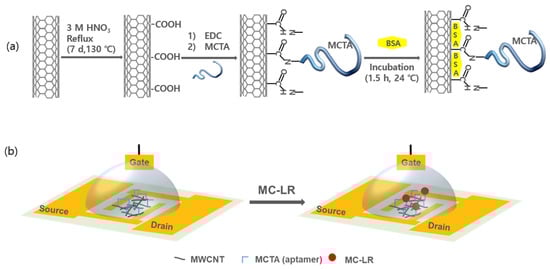 Schematic illustration of top-gated field-effect transistor using functionalized MWCNTs. (a) Bioactivation of MWCNTs via chemical bonding between microcystin-LR targeted aptamers (MCTAs) and carboxylated MWCNTs. (b) Selective interactions between MC-LR and the MCTAs attached to the top-gated field-effect transistor (FET).