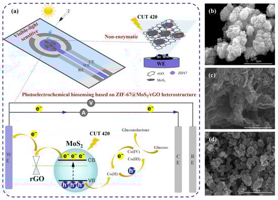 (a) Schematic diagram of the visible-light-sensitive PEC biosensing based on non-enzymatic ZIF-67@MoS2/rGO; SEM characterization of (b) MoS2, (c) MoS2/rGO, and (d) ZIF-67@MoS2/rGO.