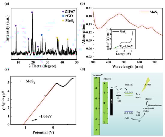(a) XRD of ZIF-67@MoS2/rGO. (b) UV-visible absorption spectrum and Tauc diagram of MoS2; (c) M-S diagram of MoS2. (d) PEC biosensing mechanism diagram of ZIF-67@MoS2/rGO.