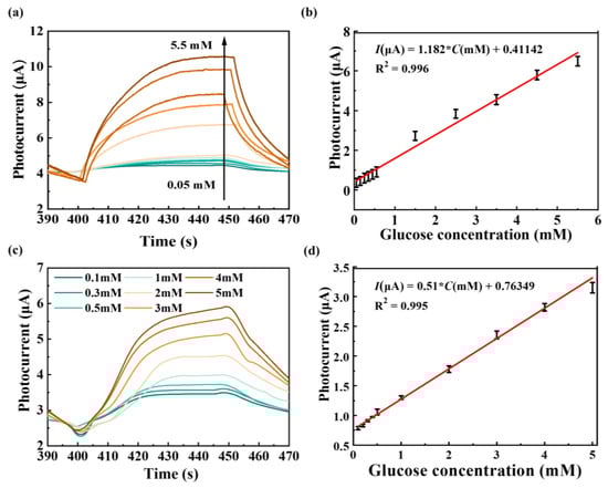 (a) The photocurrent–time curves of ZIF-67@MoS2/rGO GCEs with the successive injections of glucose into 0.1 M NaOH electrolyte. (b) The linear fitting of photocurrent vs. glucose concentration corresponding to (a). (c) The photocurrent–time curves of ZIF-67@MoS2/rGO SPEs with the successive injection of glucose into 0.1 M NaOH electrolyte. (d) The linear fitting of photocurrent vs. glucose concentration corresponding to (c).