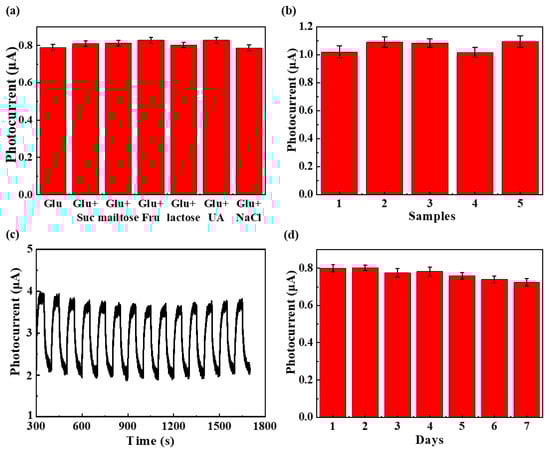 Glucose is an important biomarker in the clinical detection of hyperglycemia and diabetes. Up to now, there have been many methods for glucose detection, including fluorescence detection [1], Raman spectroscopy detection [2] and colorimetric methods [3], electrochemical detection [4,5,6], photoelectrochemical (PEC) detection [7], etc., by analyzing the correlation between different signals and glucose concentration. Among them, the PEC technique has received tremendous research interest due to its merits of fast response, low background signal, and high sensitivity, which have been extensively investigated in the fields of protein, nucleic acid, biomolecules, and metal ions [8,9,10,11]. Compared with the electrochemical method, it should work with a light source which is utilized to excite the electrode to produce photogenerated electron–hole pairs, and then the electrons are transferred to the surface of the electrode, achieving the conversion of photo energy to electrical energy.