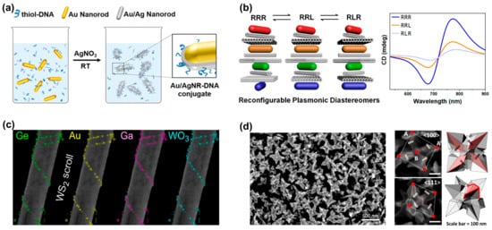 Compared to DNA, amino acids, micelles, etc., the use of naturally “hard” inorganic templates provides more freedom for further processing steps or the functionalization of optically active nanoparticles [17]. In 2017, Cheng et al. suggested the utilization of silica nanohelices as a chiral template substrate for the self-assembly of gold nanoparticles through electrostatic adsorption, leading to a chiral three-dimensional superstructure composed of gold helices [19]. Similarly, employing the nanosilica helical structure as a template, Negrín-Montecelo et al. sequentially self-assembled gold and TiO nanoparticles onto the substrate, and finally achieved a composite chiral structure with photocatalytic properties [20]. In addition to silica templates, layered van der Waals materials (WS2) have also been used as templates for the chiral assembly of nanoparticles. Kachtík et al. found that both metallic and dielectric nanoparticles were adsorbed to the nanotube surface through the chemically active site: an unsaturated sulfur bond in WS2 [17]. As shown in Figure 2c, they demonstrated the assembly of various chiral nanoparticle structures based on WS2 nanotubes, including metals (Au, Ga), semiconductors (Ge, GaAs), and oxide nanoparticles (WO3).