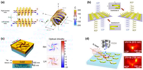 Two-dimensional planar chiral nanostructures are also known as pseudochiral nanostructures but exhibit hand-dependent responses to circularly polarized light at normal incidence. These structures acquire chirality through chiral-substrate-induced symmetry breaking or manufacturing defects, which eliminates the need for 3D characteristics, thus simplifying the fabrication process [31]. Figure 3c shows a typical planar chiral nanostructure [28]. The simulation results indicate the significantly enhanced near-field optical chirality.