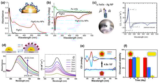 PCCD is another important method used to identify chiral molecules, where the CD originates from the Coulomb interaction (dipole and multipole) between the chiral molecule and the achiral plasmonic structures [41]. Figure 6a shows a comparison of the absorption spectra of gold nanoparticles functionalized with and without FlgA3 peptides [10]. Compared with the absorption peak of the FlgA3 peptide located in the ultraviolet band, the FlgA3 peptide–Au particle complex produced a new absorption peak at ~520 nm, resulting in the repeatable characteristic peaks in the visible light band of CD spectrum. Figure 6b shows the comparison results of CD spectra of three different structures: FlgA3 peptides, an Au particle, and a FlgA3 peptide–Au particle complex. This newly induced CD peak is mainly attributed to the electronic interaction between the chiral peptide and metal electrons [10].