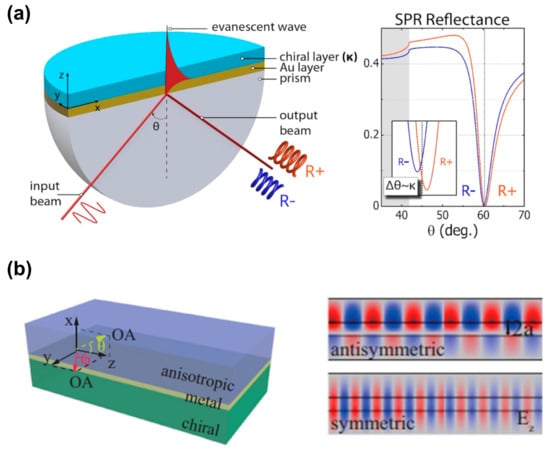 Recently, researchers have discovered that macroscopic platforms based on surface plasmons are also expected to recognize and detect chiral molecules. Droulias and Bougas [11] proposed an angle-resolved chiral surface plasmon resonance (SPR) scheme based on the Kretschmann configuration, as shown in Figure 7a, which detects the absolute chirality (handedness and magnitude) of chiral samples. As SPR reflectance is sensitive to both the real and imaginary parts of the refractive index of the chiral samples, the reflection spectrum curve in Figure 7a indicates that the excitation angle of SPR is different for various chiral layers. Therefore, the excitation angle is used to characterize the chiral molecules. Although this work only contains theoretical calculations and simulation results, it provides a simple idea for the identification of chiral enantiomers. Similarly, as shown in Figure 7b, Zhang et al. [44] proposed a simple waveguide structure built from anisotropic birefringent crystal–metal–chiral media, revealing the chirality-dependent dispersion and propagation properties of surface plasmon polaritons. The theoretical results demonstrate that this structure discriminates between the magnitude and sign of the real and imaginary parts of chirality parameters.
