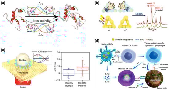 As the most common form of dementia, Alzheimer’s disease (AD) affects more than 240,000 people worldwide. Studies have shown that the polymerization of amyloid-β (Aβ) peptides into amyloid fibrils is a key issue in the pathogenesis of AD. Therefore, the inhibition of Aβ aggregation is considered an attractive therapeutic and preventive strategy for AD treatment. In 2014, Li et al. [56] first reported their investigation on the enantioselective inhibition of Aβ aggregation. They designed two triple-helical binuclear metal supramolecular complexes as a new type of chiral amyloid-β inhibitor. As shown in Figure 8a, these metal complexes enantioselectively inhibit Aβ aggregation by targeting α/β-discordant extensions at early stages of aggregation. This study provides new insights into the chiral inhibition of Aβ aggregation and opens a new avenue for the design and screening of chiral drugs as Aβ inhibitors against AD. Subsequently, Tang’s research group [57] designed and prepared 3.3 nm L- and D-glutathione-stabilized gold nanoparticles (denoted as L3.3 and D3.3, respectively). Both chiral nanoparticles inhibit Aβ42 aggregation and pass the blood–brain barrier after intravenous administration without causing significant toxicity. Experimental results indicate that D3.3 has a greater binding affinity for Aβ42 and higher brain biodistribution compared with enantiomer L3.3, producing a stronger inhibitory effect on Aβ42 fibrillation in AD model mice. In addition to the method of directly using chiral signals for detection, Wang et al. [54] also synthesized L/D-Pt@Au triangular nanorings as a label-free surface-enhanced Raman spectroscopy platform to detect Aβ fibrils with ultra-high sensitivity, with the experimental results displayed in Figure 8b. This opens the means for the early diagnosis of diseases caused by protein misfolding using chiral plasmonic nanomaterials as ultrasensitive SERS substrates.