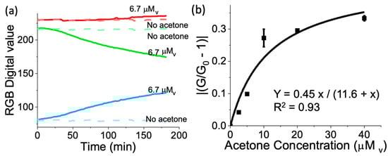 Response of the sensor towards acetone was measured in a range from 0 mMv to 40 mMv. The sensor response was assessed as described in the Materials and Methods section for RGB light intensity components (Figure 2a). The highest light intensity changes were observed for green and blue light intensity components. The green light intensity component decreased with the acetone exposure over time, which was indicative of increasing absorbances in the green wavelength range as observed in the spectral changes registered for the sensor upon exposure to acetone vapors in the visible spectrophotometric experiments shown in Figure 1d. On the contrary, the blue light intensity component increased with the acetone exposure over time, which was in correlation with the increasing absorbances in the blue wavelength range observed in the visible spectrophotometric experiments shown in Figure 1d. No significant changes in red light intensity component were observed in coincidence with the visible spectral changes (Figure 1d).
