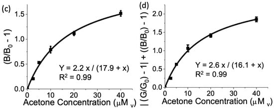 Figure 2b,d shows the sensor response for the absolute green light intensity changes, blue light intensity changes, and for the additive, absolute green and blue light intensity changes to acetone vapors (evaluated at a fixed time of acetone exposure). In all cases, the sensor response followed a non-linear response with a Langmuir-like behavior. Therefore, we used the Langmuir equation to fit the sensor response, which resulted in a squared-correlation coefficient (R2) higher than 0.99. It is worth noticing that we performed three tests at each concentration to build the calibration curves.