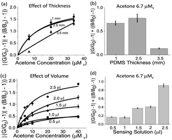 We observed that the sensitivity of the liquid probe-based acetone sensor can be tuned to different acetone concentration ranges by optimizing the parameters of the sensor: volume of the liquid probe inside the sensor and the thickness of the diffusional barrier (PDMS) between the gas phase and the liquid sensing probe (Figure 1c). Therefore, we systematically investigated these geometrical parameters. Figure 3a,b shows the effect of increasing the PDMS thickness from 1.0 to 3.5 mm, which was controlled by the PDMS weight added to the sensor mold. We observed that the sensor showed an optimal thickness with a maximum response at 2.5 mm. This effect may result from two contributing opposite influential factors: a sensor sensitivity increase with the PDMS thickness increase due to the known PDMS pre-concentrating properties for acetone [69], and a sensor sensitivity decrease with the PDMS thickness increase due to the increase in the diffusional barrier of acetone into the sensing probe. On the other hand, Figure 3c,d shows the effect of increasing the liquid sensing probe volume from 0.5 to 2.5 μL. We observed that increasing the volume inside the sensor increases the sensor response and that a volume of liquid sensing probe of 2.5 μL increases the sensitivity by two-fold with respect to 1.5–2.0 μL and by over four-fold with respect to 0.5–1 μL. This observation was in line with the increasing number of available sensing probe molecules in the sensor.