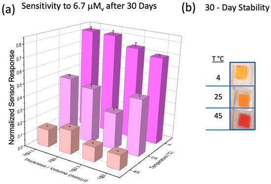 Stability test for acetone sensor over time under different configurations of PDMS thickness, liquid sensing probe volumes, and storage temperature conditions. (a) The plot shows the response of the sensors to acetone at a concentration of 6.7 mMv after normalization by the corresponding response assessed on day 1. Each point represents the averaged response for six sensors and the corresponding standard deviation (error bar). The sensor configuration that showed the best stability was the sensor with 2 mm of PDMS thickness and 2.5 μL of liquid sensing probe solution stored at 4 °C for a period of one month. (b) Picture of the sensors after exposure to different temperatures for a period of 30 days.