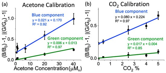 Calibration curves of the liquid probe-based sensor exposed to different concentrations of (a) acetone and (b) CO2. The curves show the calibration equations resulting from the blue and green light intensity components and represent a linear behavior with R2 greater than 0.92. Liquid probe-based sensor conditions: 3.5 mm of PDMS thickness, 2.5 μL of sensing probe.